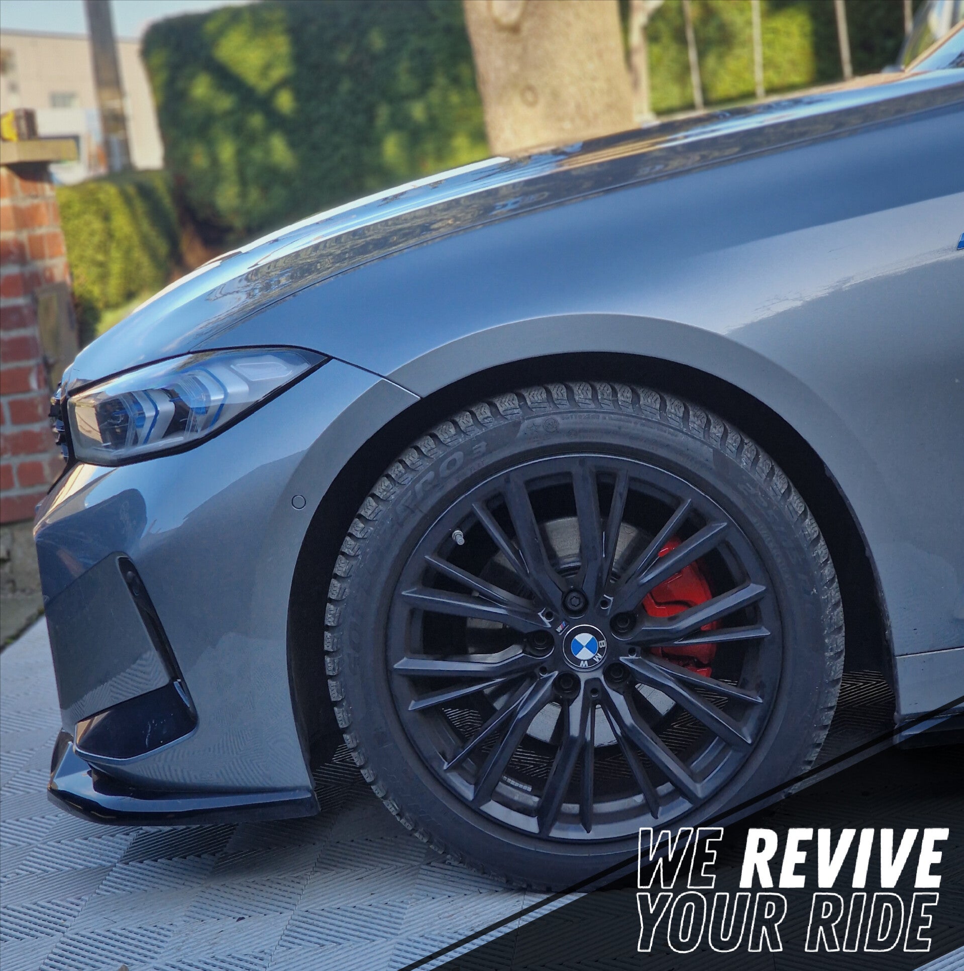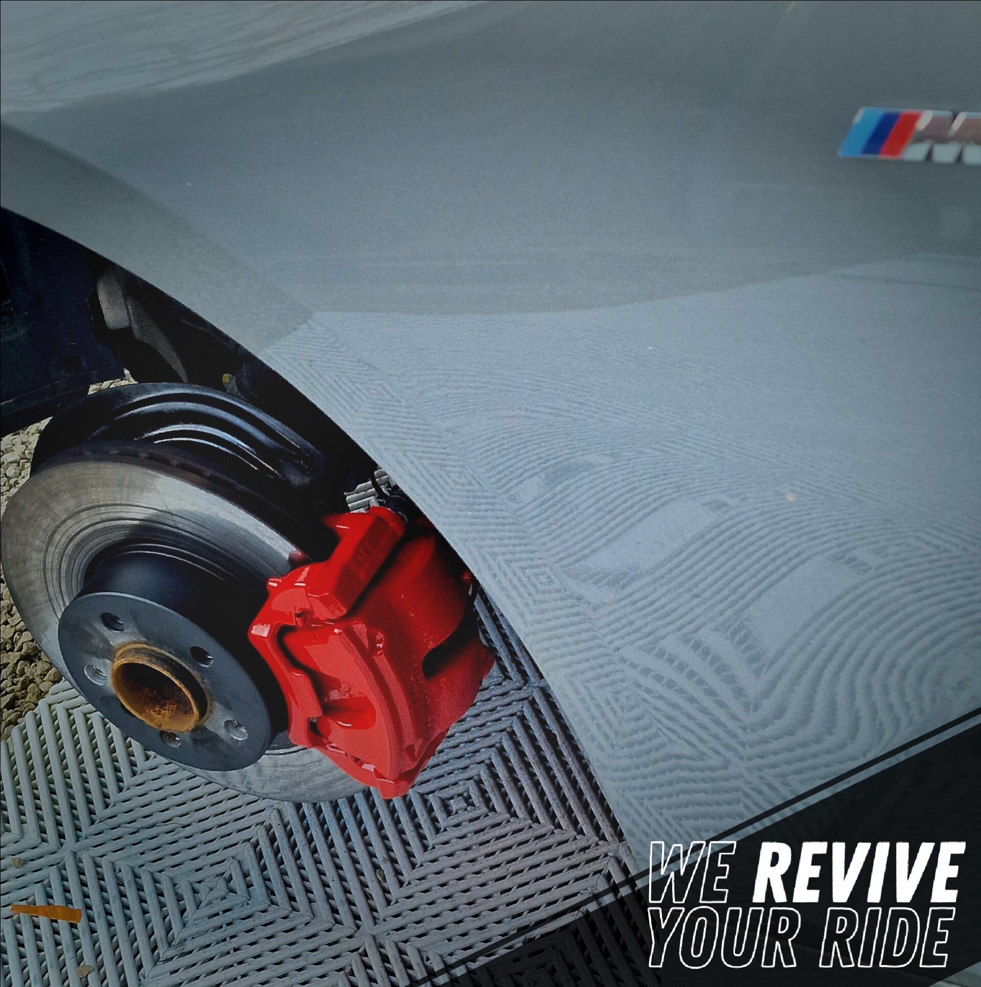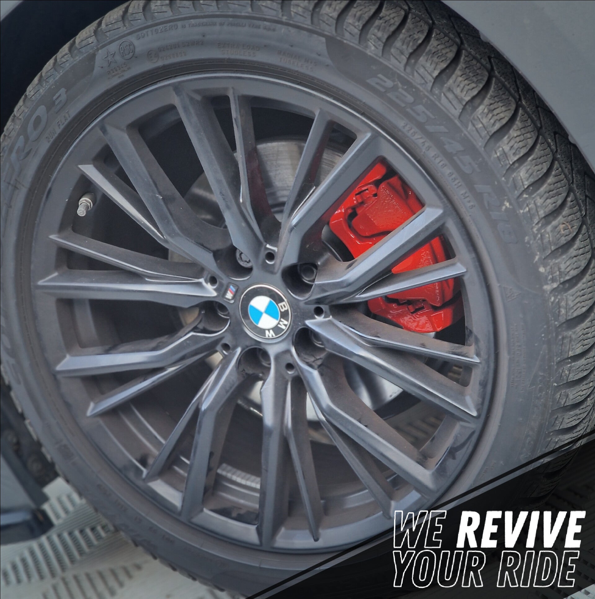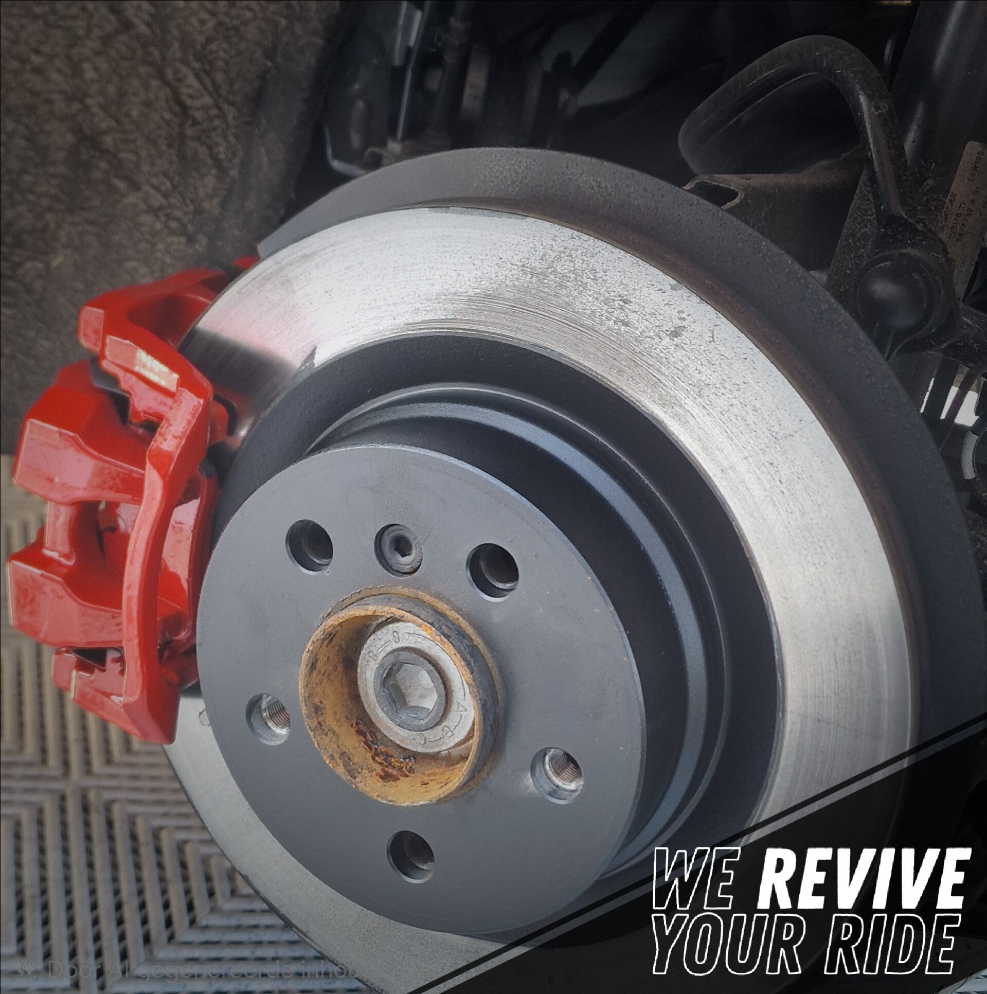 De klant wou mooie knalrode remklauwen, daar hebben wij voor gezorgt! De remschijf vertoonde ook wat oppervlakkige roest en had een grijze uitstraling. Dus werden deze geschuurd, primer aangebracht en herspoten in het matzwart wat past bij de matzwarte velgen.